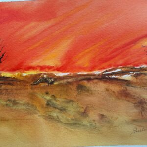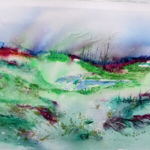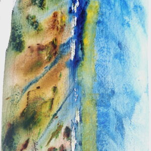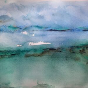 This watercolor painting depicting a seascape. The scene features a dynamic ocean with waves in shades of blues and turquoise. Above the water, there is a cloudy sky with various tones of grey and white, adding a dramatic effect to the scene. In the horizon,a subtly strip of land is visible, providing depth and composition. The use of soft blending and watery textures convey a sense of movement and atmosphere.