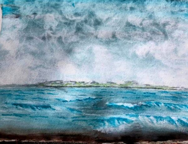 This watercolor painting depicting a seascape. The scene features a dynamic ocean with waves in shades of blues and turquoise. Above the water, there is a cloudy sky with various tones of grey and white, adding a dramatic effect to the scene. In the horizon,a subtly strip of land is visible, providing depth and composition. The use of soft blending and watery textures convey a sense of movement and atmosphere.