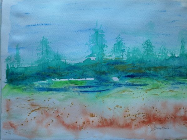 Capturing a quiet moment where sky and land meet in soft, misty tones. The gentle movement of blues and greens evoke calmness of early morning.